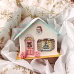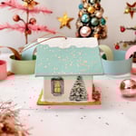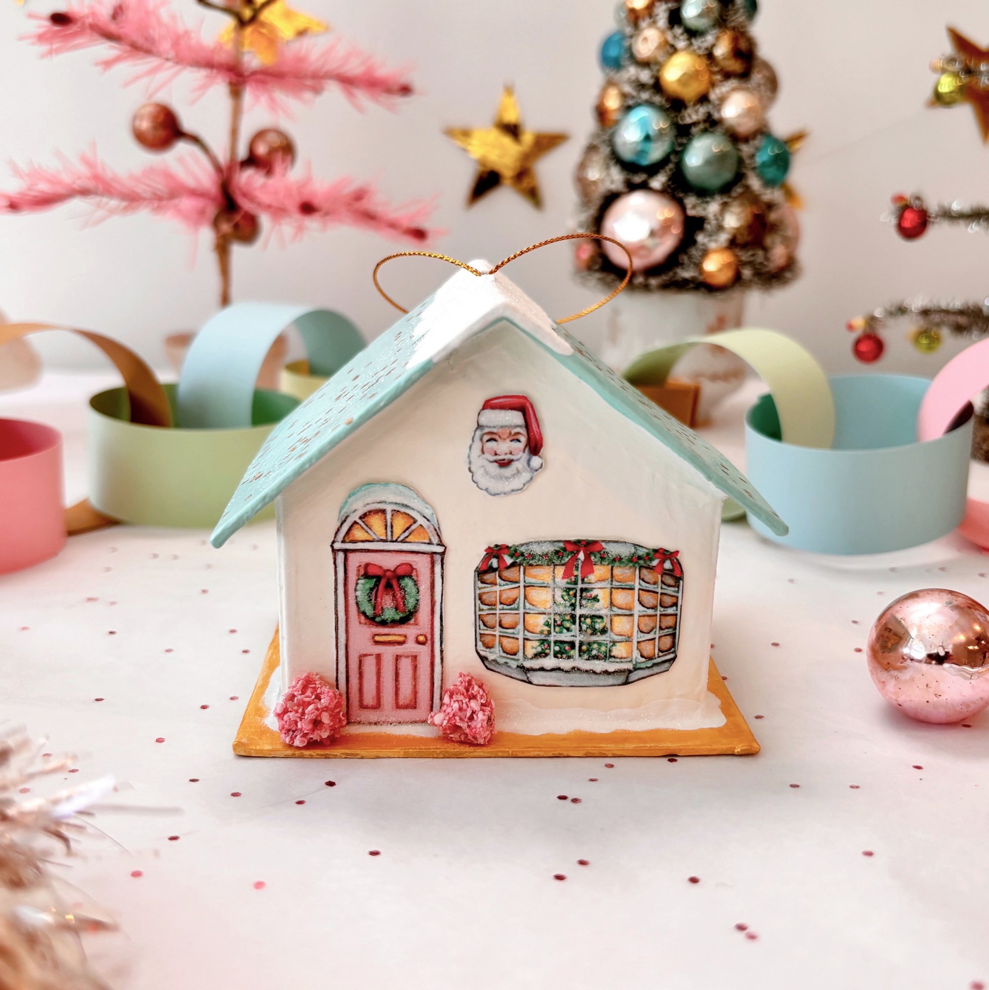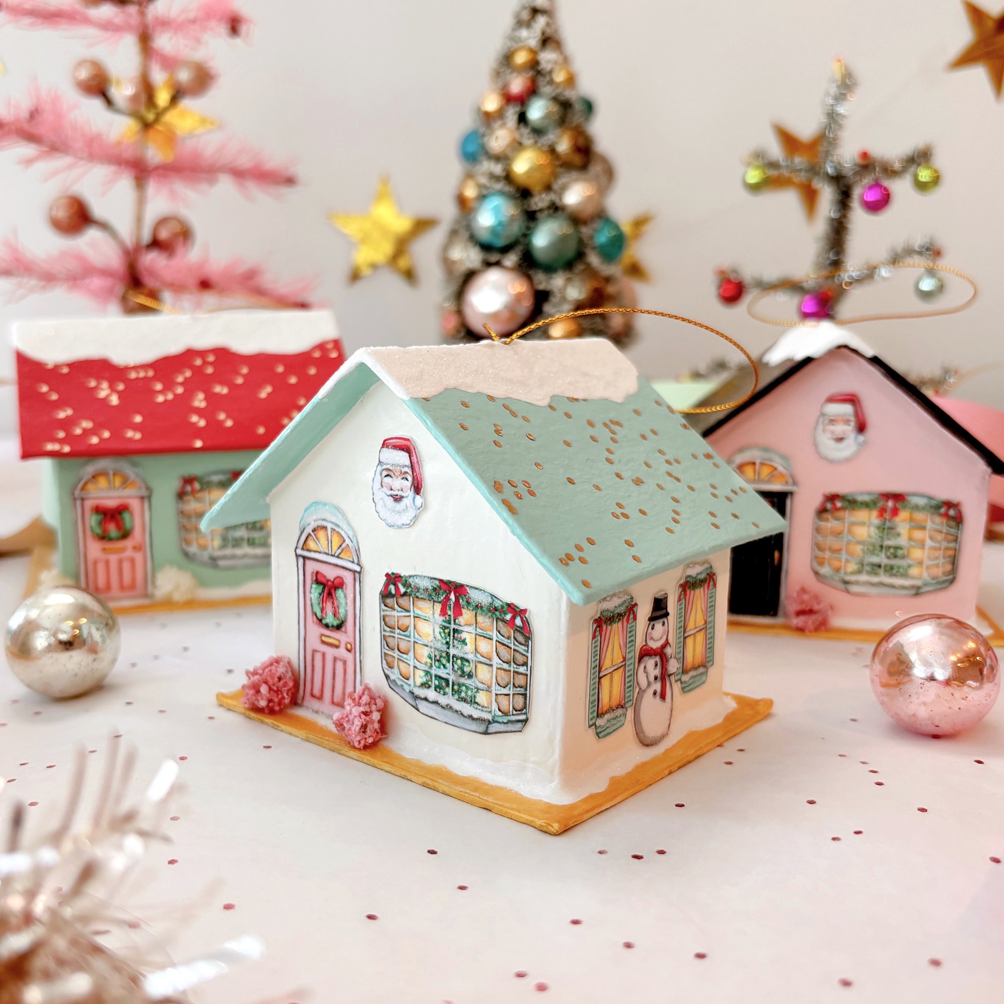 These magical mixed media Holiday house ornaments were made with so much love! So many special tiny details! There are four houses in the collection so be sure to look through the shop to find your favorite! Each is handmade, hand painted, and assembled with our own original images. We hand painted all the the windows and doors, the little smiling snowmen, the wreaths, garlands, trees, and the tiny Santa blow molds. Each house has a gold glittery roof, a big picture window with a glowing Christmas tree, and is adorned with glittering bushes and shrubs, and lots of glittery snow! The bright gold bases are reminiscent of the gold foil on vintage ornaments.
