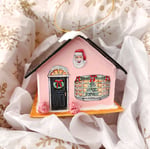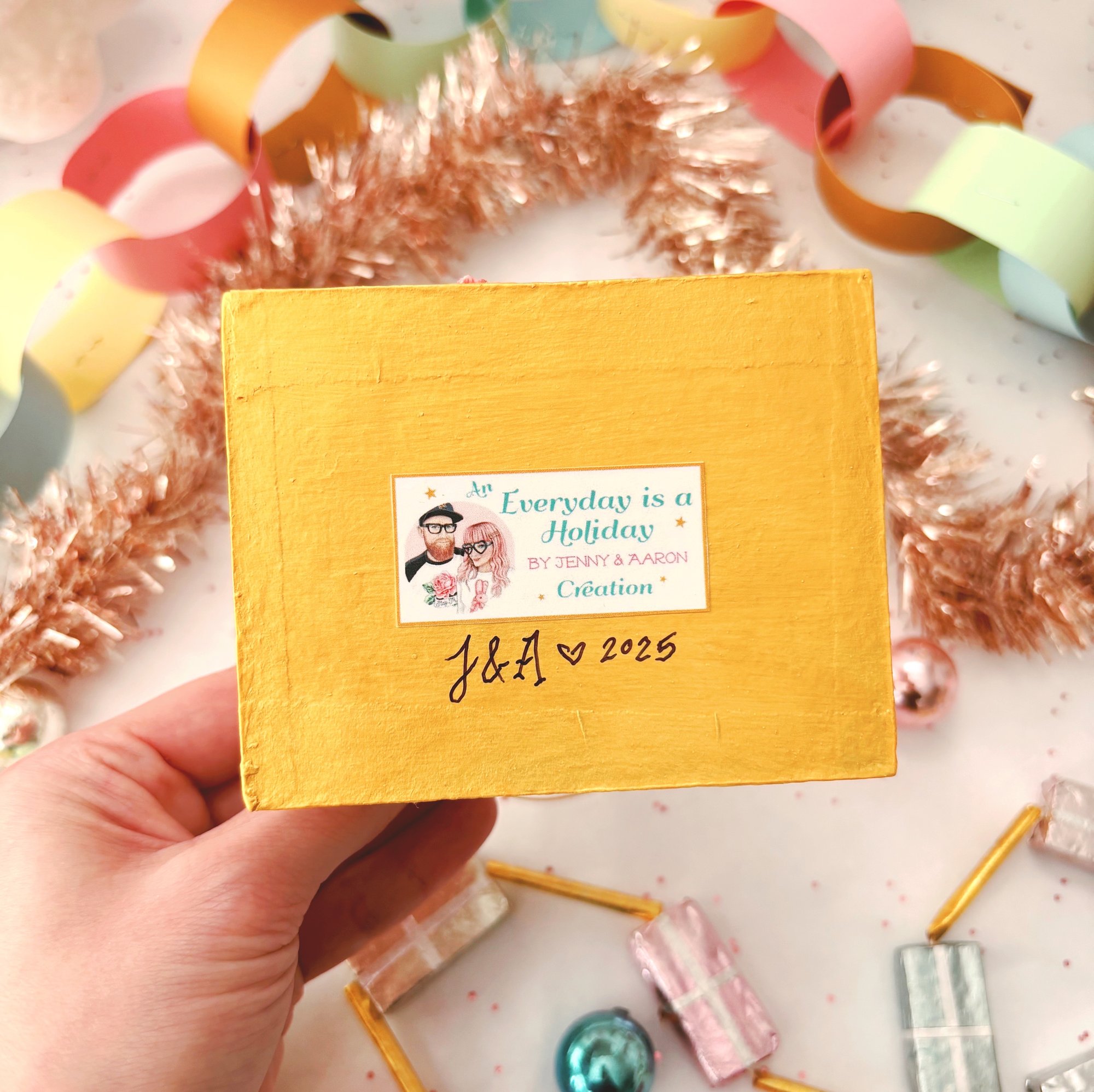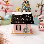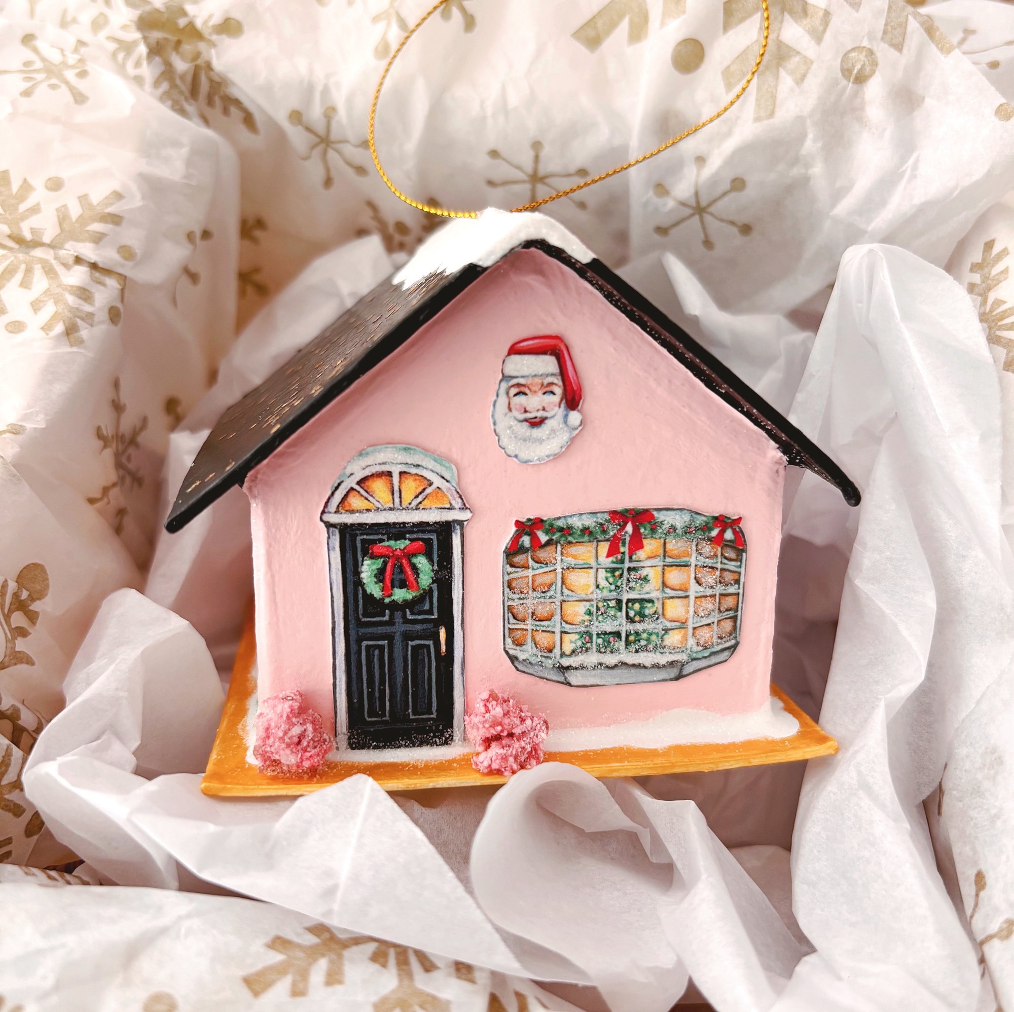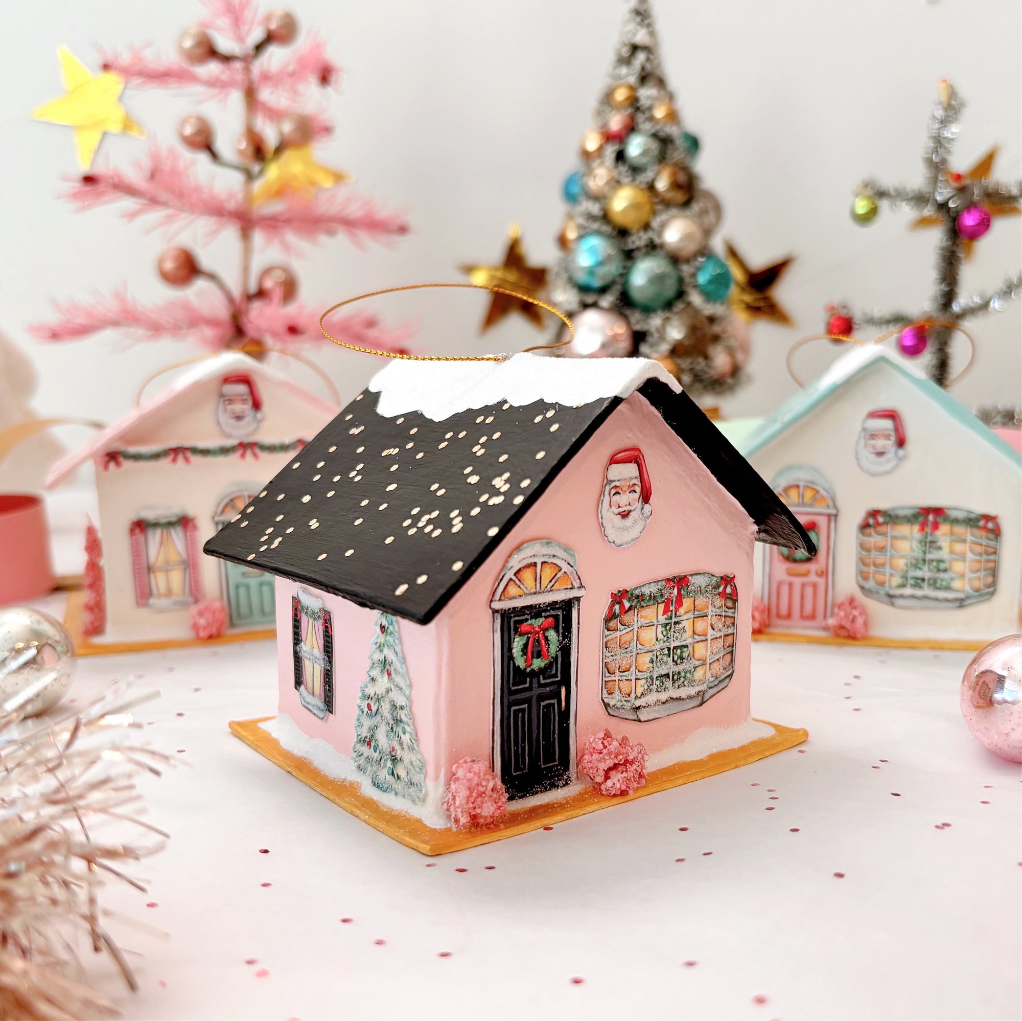 These magical mixed media Holiday house ornaments were made with so much love! So many special tiny details! There are four houses in the collection so be sure to look through the shop to find your favorite! Each is handmade, hand painted, and assembled with our own original images. We hand painted all the the windows and doors, the little smiling snowmen, the wreaths, garlands, trees, and the tiny Santa blow molds. Each house has a gold glittery roof, a big picture window with a glowing Christmas tree, and is adorned with glittering bushes and shrubs, and lots of glittery snow! The bright gold bases are reminiscent of the gold foil on vintage ornaments.
