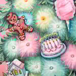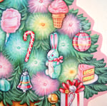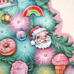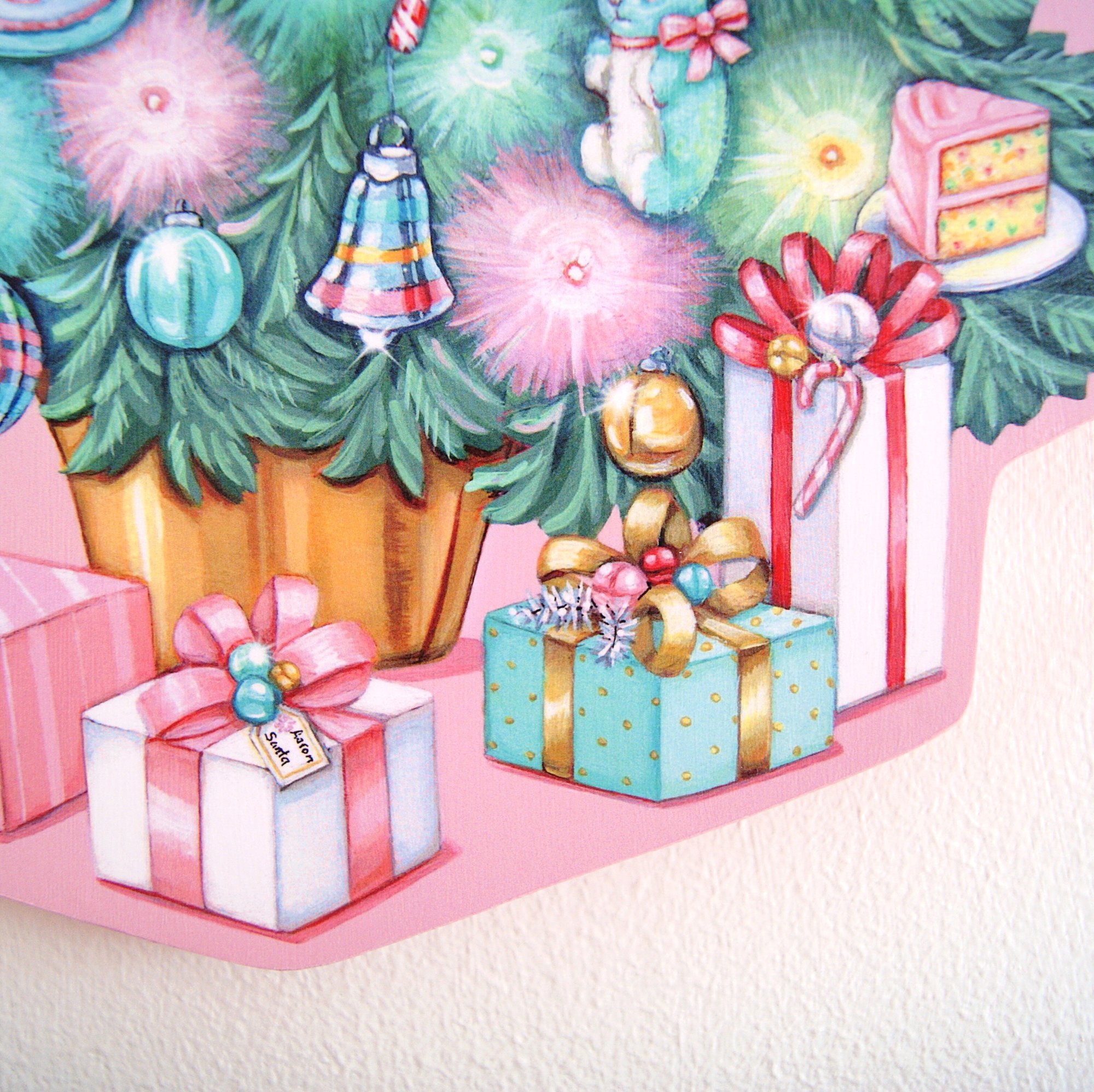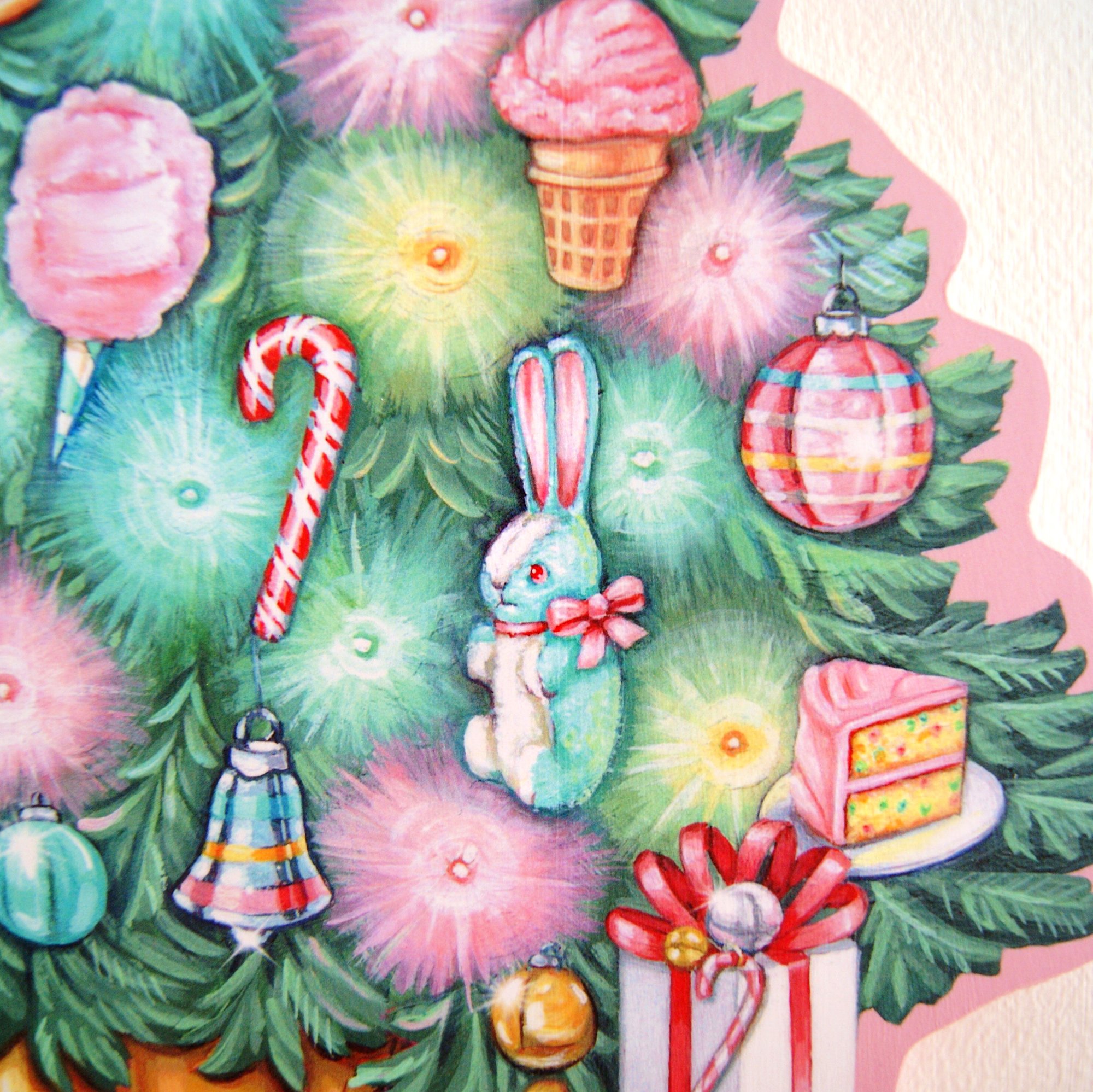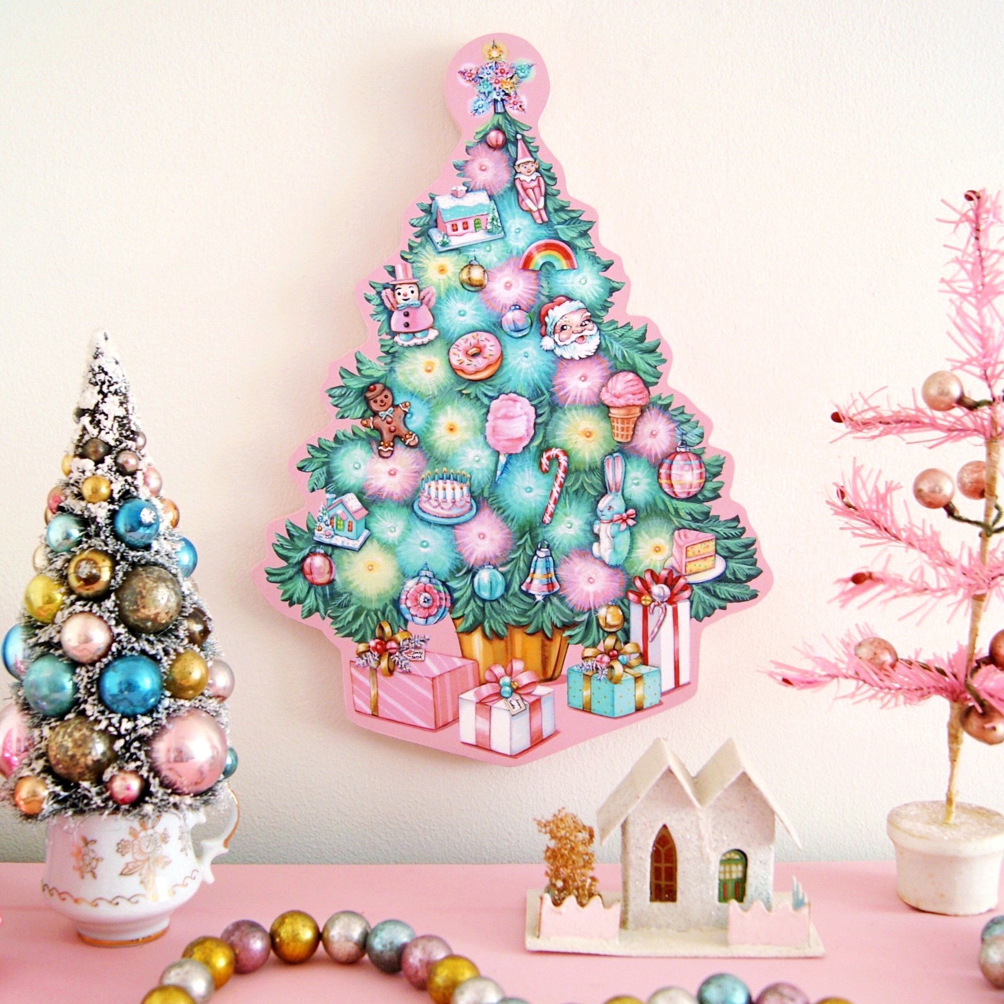 We adore the illustrations from 1940s-50s holiday cards and wanted to capture that same magical vintage glow using our signature color palette - pink, aqua, pale yellow, minty green, and little pops of berry red. Vintage Shiny Brites mingling with Cotton Candy, Putz Houses, a Gingerbread Man, a little pink Knee Hugger Elf, a vintage Stuffed Bunny, Birthday Cake, Pink Donut, Funfetti Cake...all our faves!
