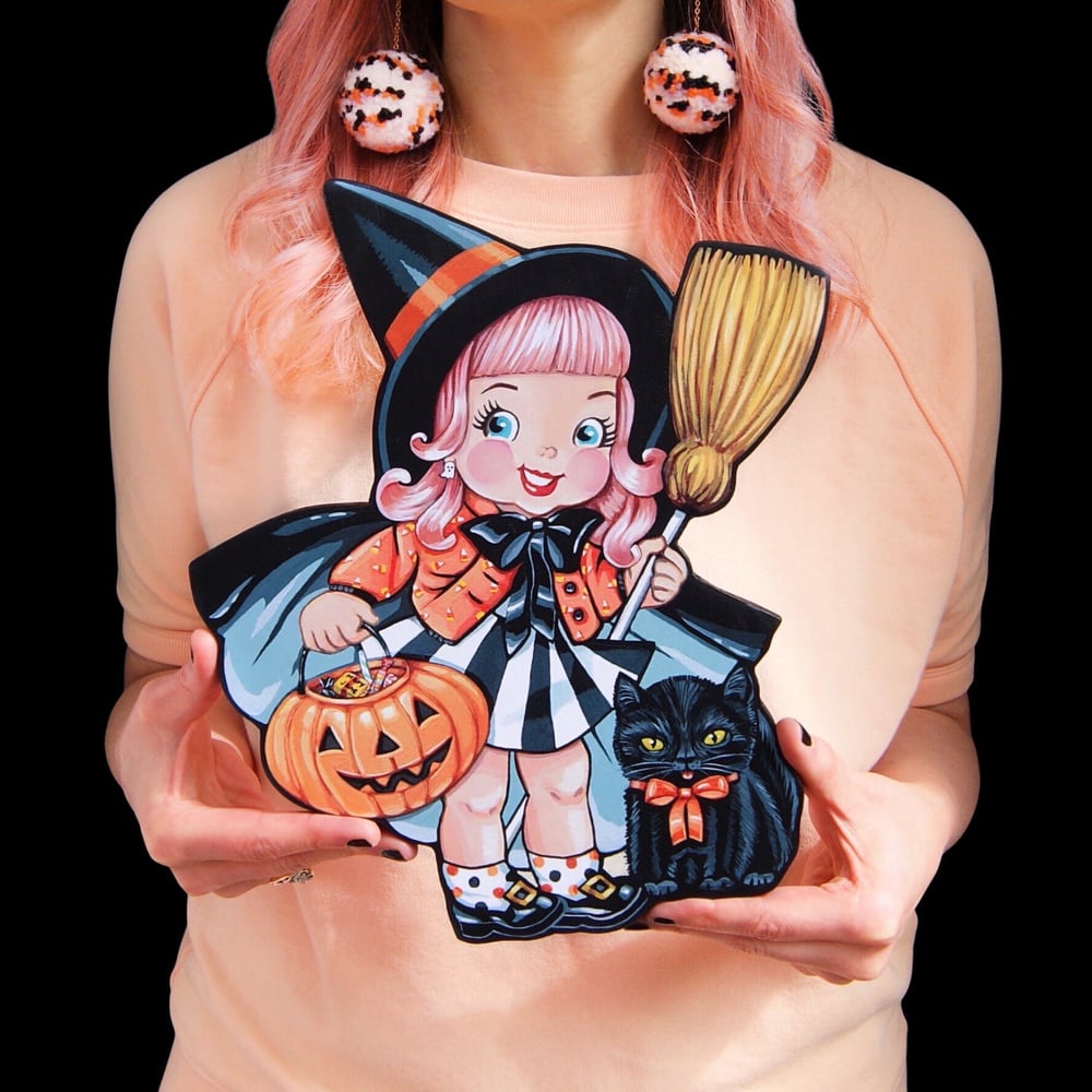 Maybe the only thing cuter than this little Trick or Treat Witch is her adorable little black cat!