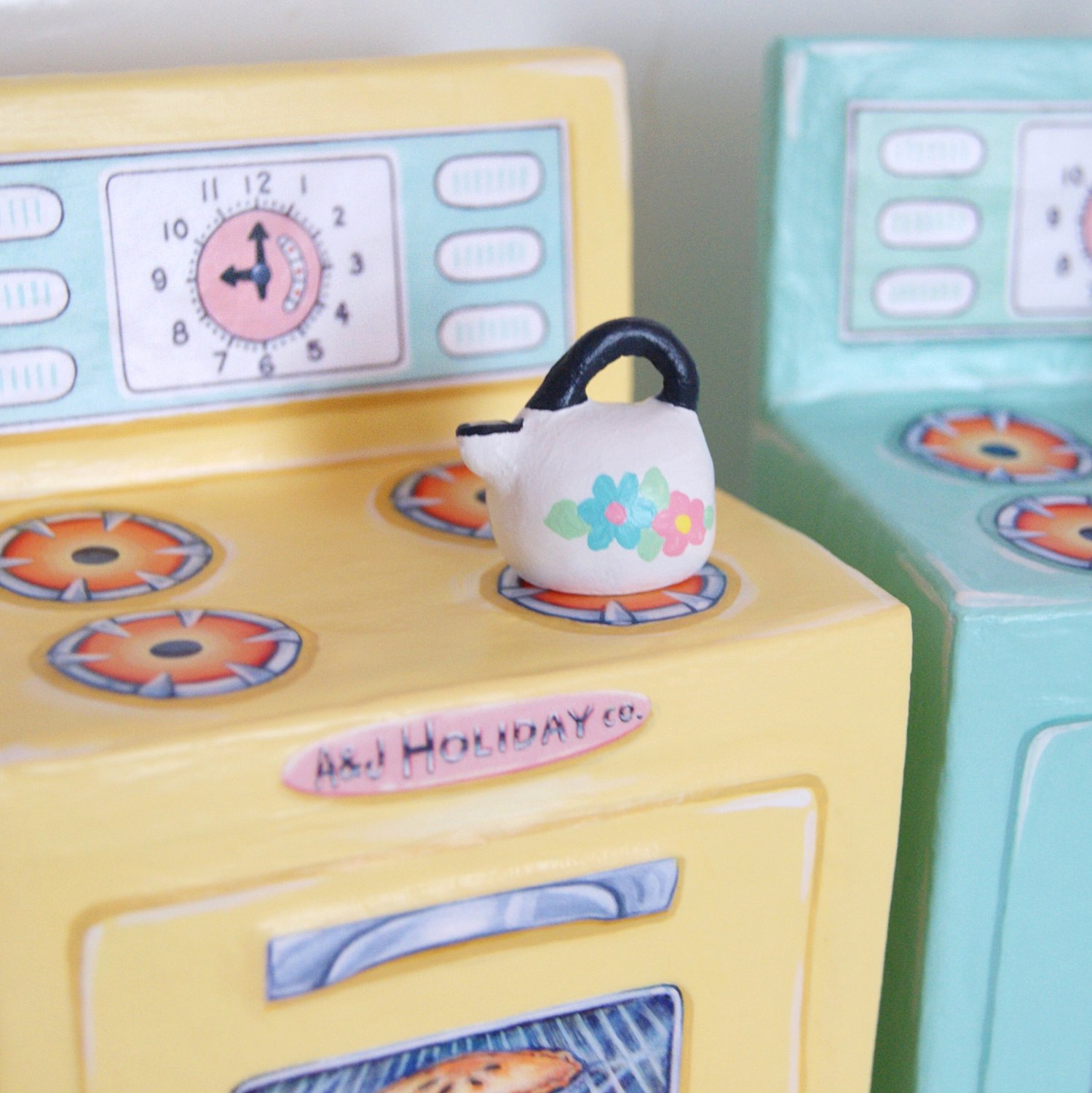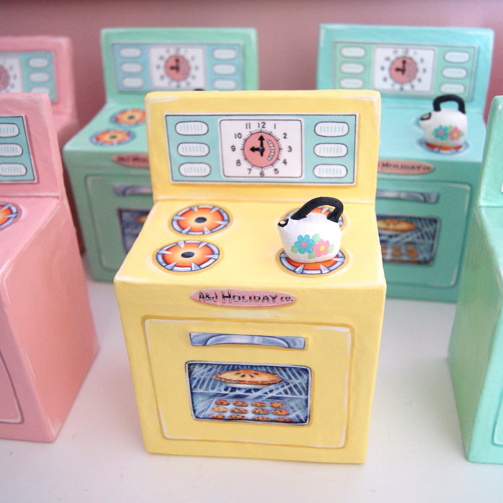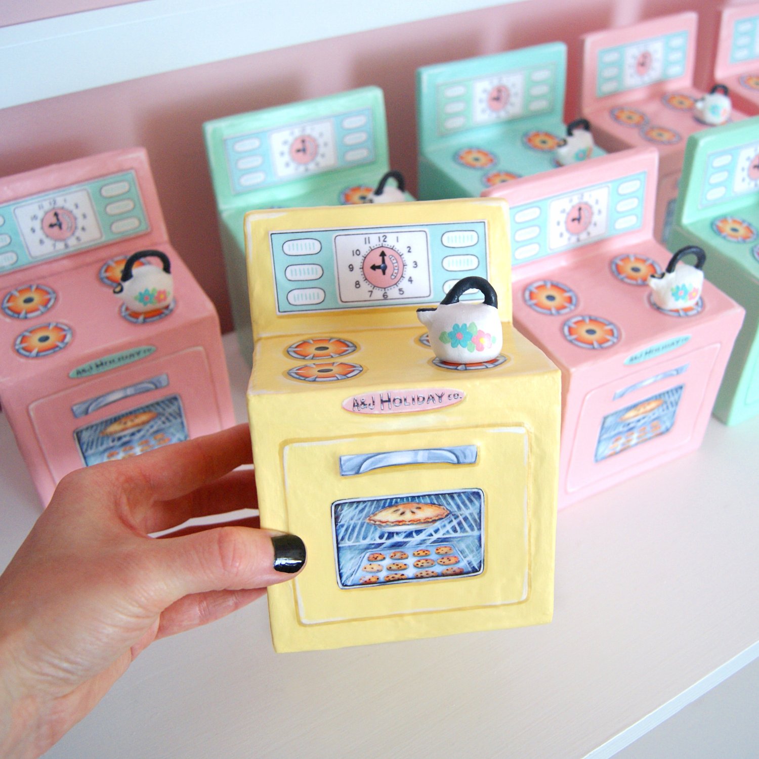 Inspired by mid century tin toy stoves in all their pastel colored magic! Each stove is sculpted with paper mache and various mixed media materials, hand painted, and adorned with super cute graphic details of our original paintings. We love the rounded corners and semi wavy look of paper mache. They're perfectly imperfect!