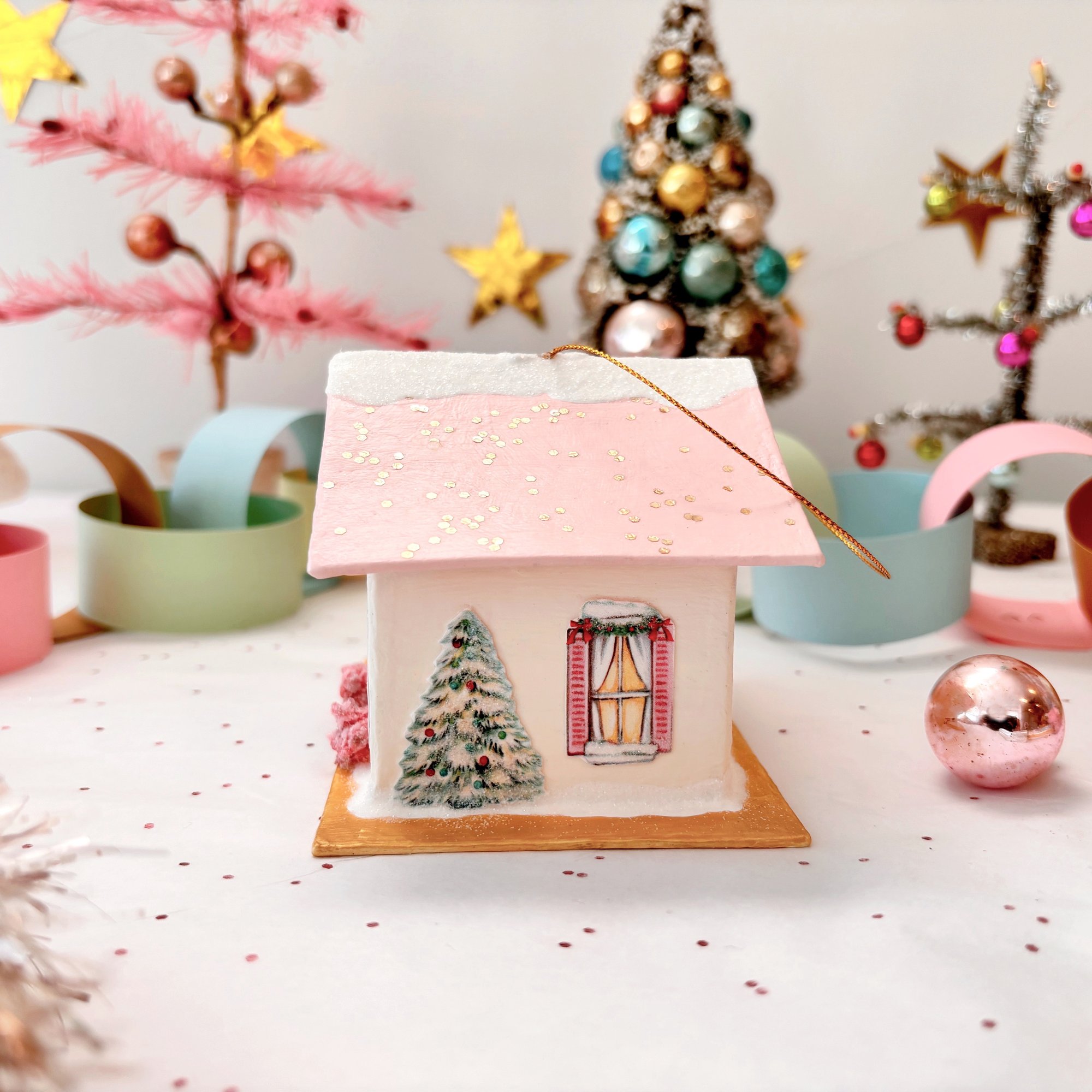These magical mixed media Holiday house ornaments were made with so much love! So many special tiny details! There are four houses in the collection so be sure to look through the shop to find your favorite! Each is handmade, hand painted, and assembled with our own original images. We hand painted all the the windows and doors, the little smiling snowmen, the wreaths, garlands, trees, and the tiny Santa blow molds. Each house has a gold glittery roof, a big picture window with a glowing Christmas tree, and is adorned with glittering bushes and shrubs, and lots of glittery snow! The bright gold bases are reminiscent of the gold foil on vintage ornaments.