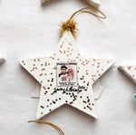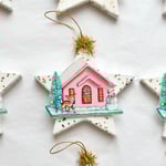 We LOVE Holiday ornaments that feature tiny vignettes that make you wish you could shrink yourself down and step inside that little world. Can you even handle the cuteness of that tiny reindeer and snowman? All the magical bits are adorned with glittery snow and the star has a sprinkling of vintage style gold glitter and is topped with a gold tinsel puff.