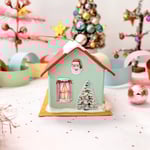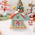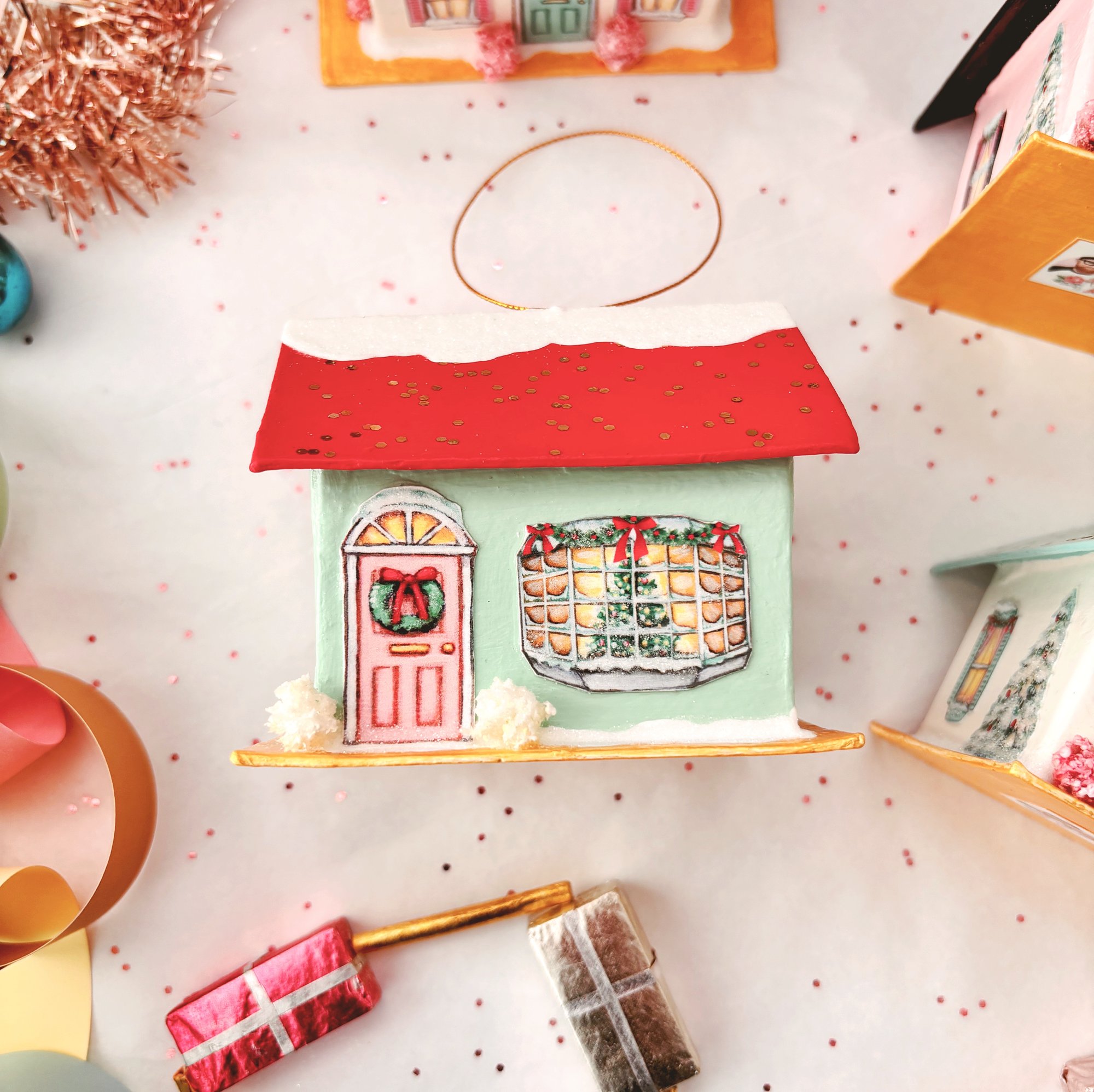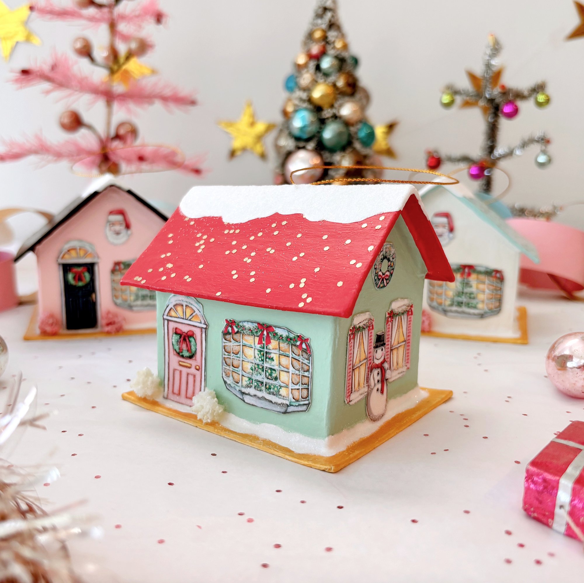 These magical mixed media Holiday house ornaments were made with so much love! So many special tiny details! There are four houses in the collection so be sure to look through the shop to find your favorite! Each is handmade, hand painted, and assembled with our own original images. We hand painted all the the windows and doors, the little smiling snowmen, the wreaths, garlands, trees, and the tiny Santa blow molds. Each house has a gold glittery roof, a big picture window with a glowing Christmas tree, and is adorned with glittering bushes and shrubs, and lots of glittery snow! The bright gold bases are reminiscent of the gold foil on vintage ornaments.